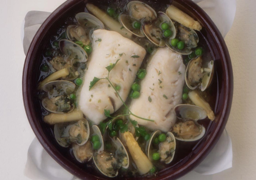 7. La Merluza con Almejas en Salsa Verde se puede llevar directamente a la mesa porque la cazuela también sirve como presentación, pero si se quieres puedes emplatar para cada comensal intentando repartir los ingredientes y regando con la salsa.